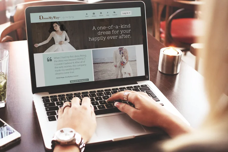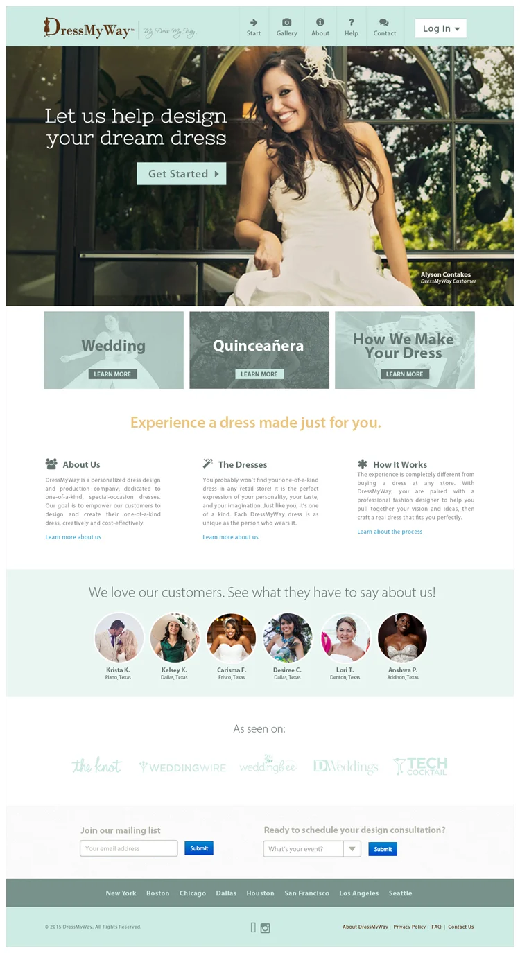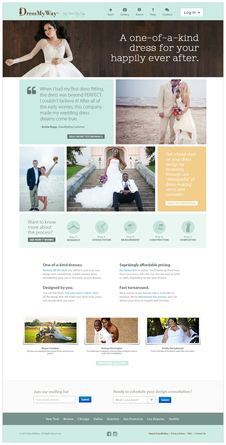 DressMyWay is a dress design and production company, with a focus on 100% custom special occasion dresses. They already had a high-quality product at a great price. They already offered a unique, personalized process to make them stand out from the crowd. They even had a solid logo in place. What they needed from me was a professional look that spoke to their target audience: young, creative, and mostly tech-savvy women. Because these women would be looking for dresses to wear during important life moments (weddings, proms, etc.), we wanted to sell the DressMyWay design process as its own memorable experience.