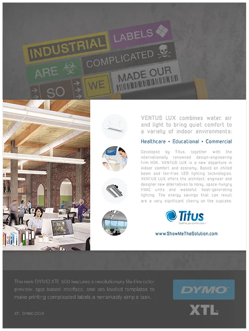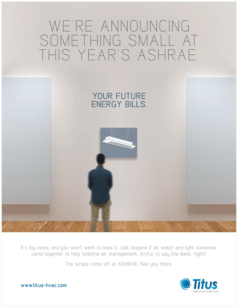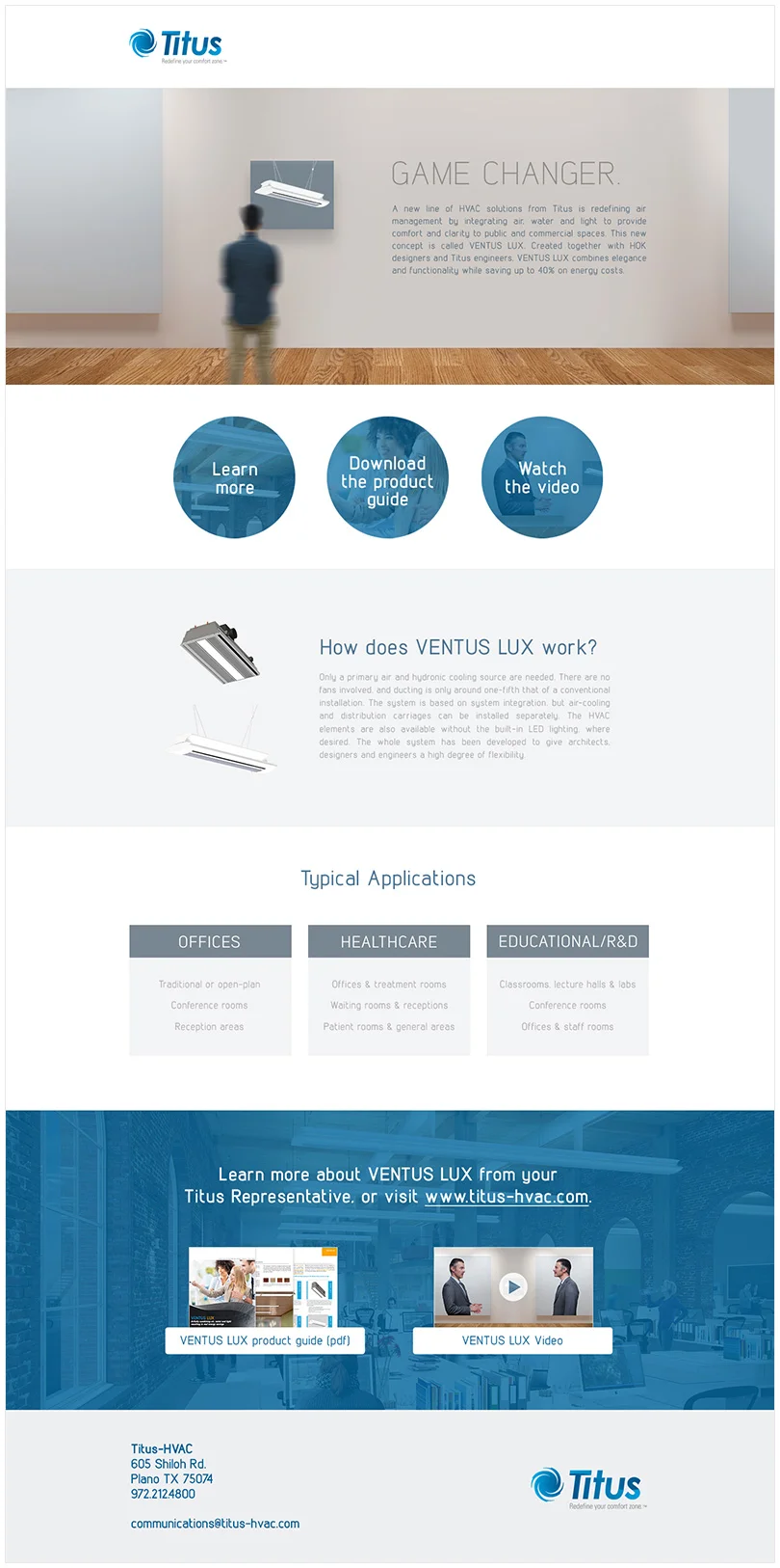 Titus is well-known for their innovation in the commercial HVAC industry, and their new product was no exception. Until the launch, there was nothing like it on the market. This was the only product of it's kind to combine both air and light distribution into a single unit. Not only does this save space, but it also saves energy. We created a print ad targeted toward architects, who would benefit from the product's beautiful and space/energy-saving design. From there, we expanded the campaign to include a promotional video, a web landing page, and a magazine bellyband.